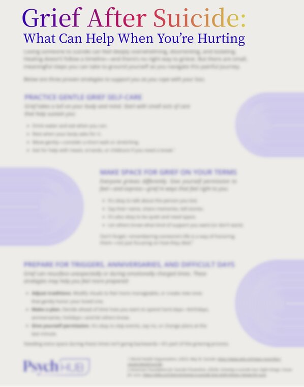 Our new guide, Grief After Suicide: What Can Help When You're Hurting, provides practical, actionable strategies to support your clients as they cope with loss of a loved one due to suicide.